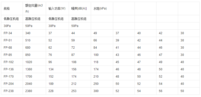 2.風(fēng)機(jī)盤(pán)管機(jī)組供氣量約為250 ~ 2500米/小時(shí),出口靜壓小于100帕(出口靜壓大于30帕為高靜壓型)。